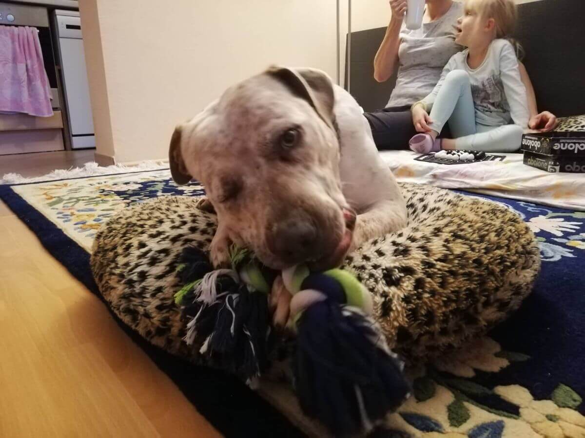 Egy kedves család fogadta őt örökbe, emberekkel, kutyákkal nagyon aranyos, élelmét, játékát nem félti már és mostanra teljesen problémamentes. Lakásban él és porszívóztatja a fenekét. 🙂